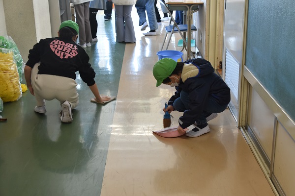 〇6年生 集中して取り組んでいます。多目的室はこの後、3年生の担任がワックスをかけました。