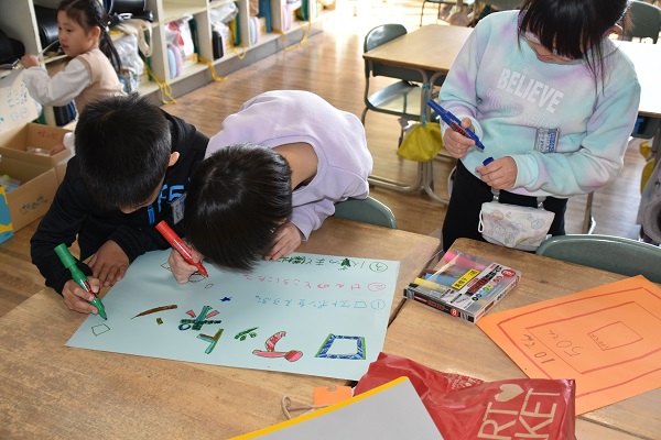 〇今日はおもちゃを紹介するポスターを作りました。カラフルなポスターになりそうですね。