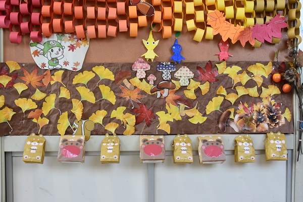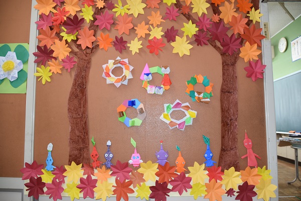 〇こすもす学級の廊下は秋が深まってきました。 〇司書さんの読み聞かせを楽しむ1年生。