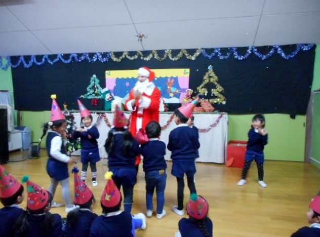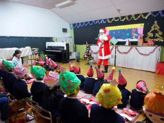 「ワー!サンタさん!!」びっくり顔の子供たちでした。お家で聞いていた、お話のサンタさんに逢えて不思議そうな表情を見せてくれました。