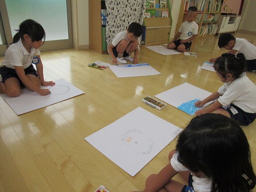 その後、大きな紙にクレヨンで、夏休みの思い出の絵を描きました。家族でのお出かけや海水浴・花火など、みんな楽しい思い出がたくさんできたようです。
