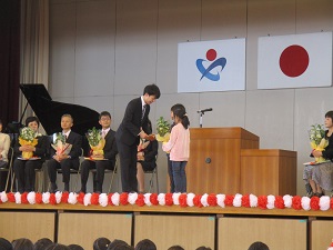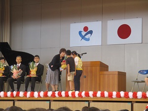 代表の児童が心をこめて綴ったお手紙とお花をプレゼントしました。