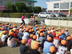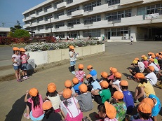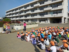 そして、青空の下、今月の歌の「校歌」を全員で合唱し、最後に学年全員で