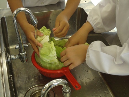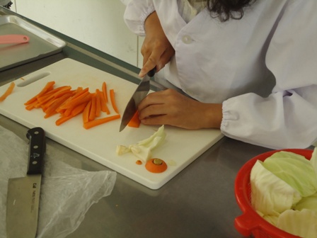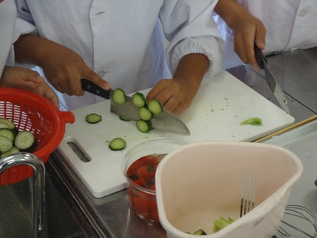 本格的な調理が始まりました。水洗い、包丁で切る、ゆでる、ドレッシング作り、盛りつけと様々な作業を協力して行い、楽しく活動できました。