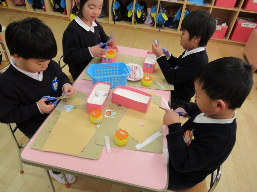 4歳児は画用紙で、5歳児は折り紙でイノシシを作りました。