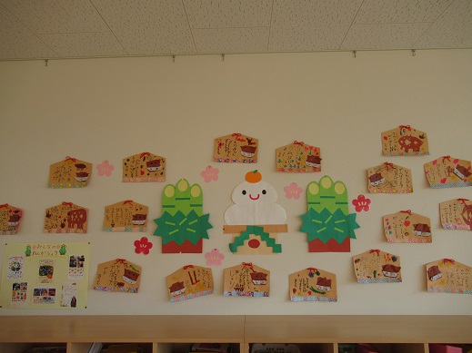 絵馬の形に画用紙を切り、そこに今年の干支のイノシシを飾りました。
