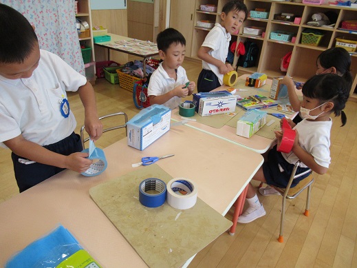 10月に予定している虫捕り遠足に向け、一人一人が自分の虫かごを作りました。