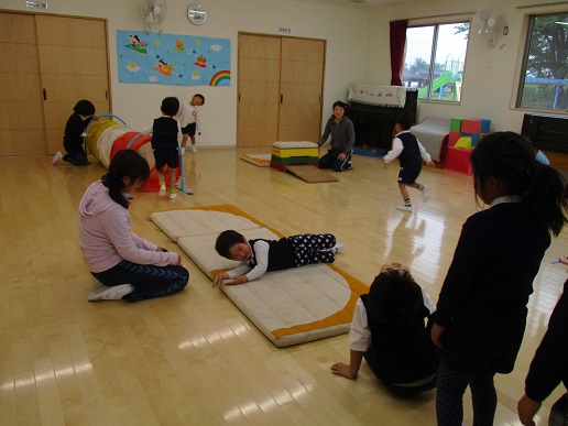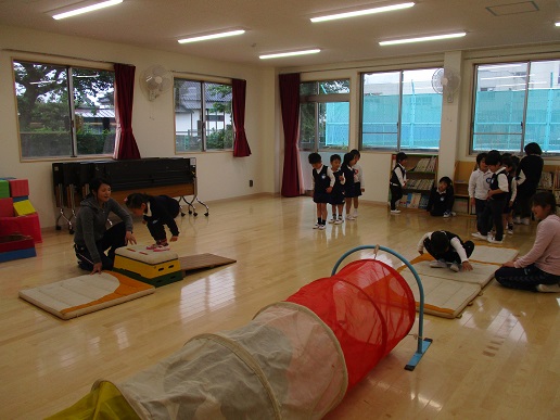今日はマットやトンネル、跳び箱を用意しました。