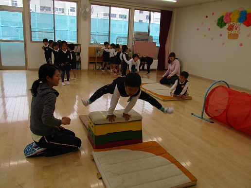 マットでころころ転がったりでんぐり返しをしたり…跳び箱にチャレンジしたり…