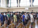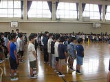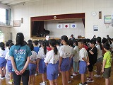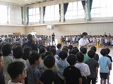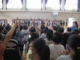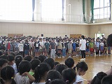 音楽朝会を行いました。第1回目は、全校のみんなで校歌を歌いました。元気な歌声が体育館に響き渡りました。