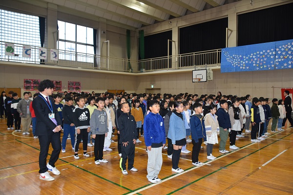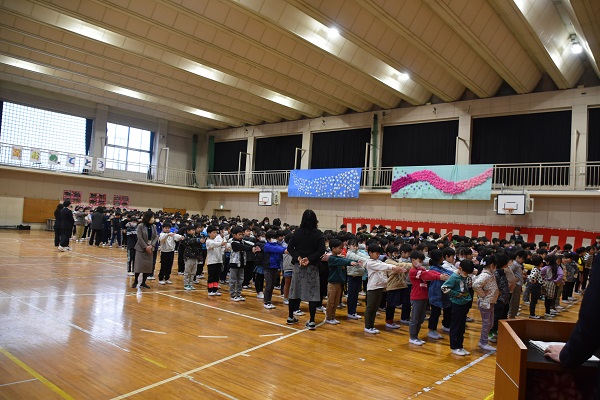 4年ぶりの体育館での修了式。校歌が体育館に響き渡りました。