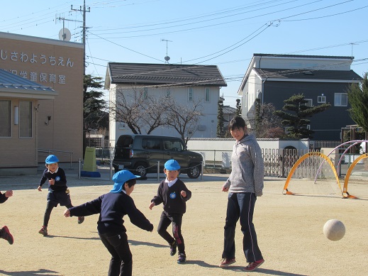 男児は毎日のようにサッカーをして遊んでいる子も多いので、チームとしての役割分担が出来てきました。ボールを蹴る力も強く、走るスピードも速くなり、対戦している職員も本気で取り組まないと負けてしまうほど上手になりました!