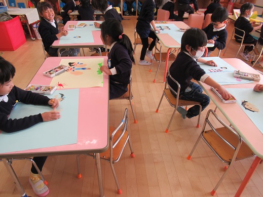 今日は、昨日行ったお別れ遠足の絵を描きました。クレヨンと絵具で描いていきます。