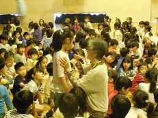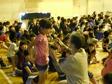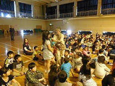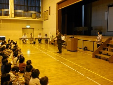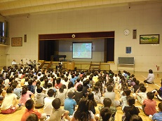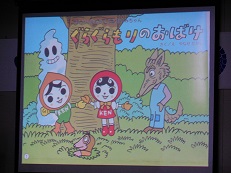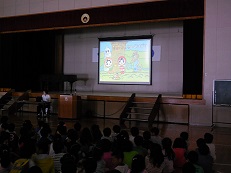 スクリーンを使っての人権についてのアニメと指導者のお話を聞きました。