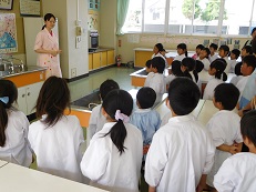 はじめに、家庭科室で給食の先生のお話を聞いて、お着替えと手洗いをしました。