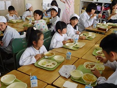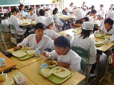 早速、5年生の3つのクラスに分かれて、給食を食べました。