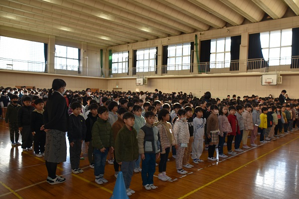 〇全員集合! 〇2学期の児童代表の言葉は2年生・6年生。堂々と発表できました。
