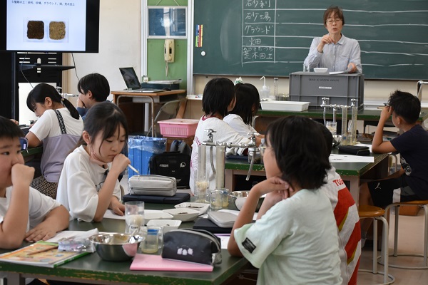 先週金曜日に4年生を対象として出前授業がありました。県立の川の博物館の先生に理科の授業をしていただきました。