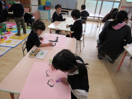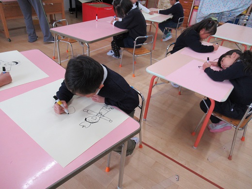 4歳児はクレヨンで描きました。5歳児は黒のペンで絵の枠線を描き、その後クレヨンで色を塗っていきました。みんな、自分が頑張った場面や楽しかった場面を表現していました!