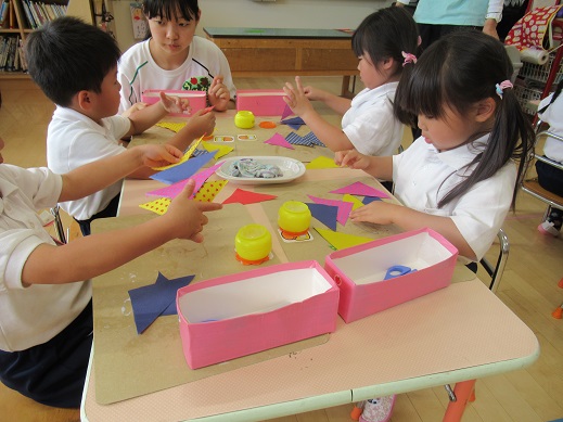 今日は、4歳児は三角つなぎ、5歳児は貝殻つなぎを作りました。
