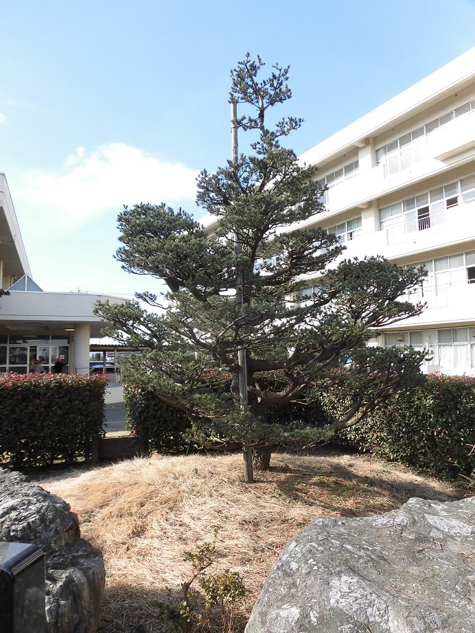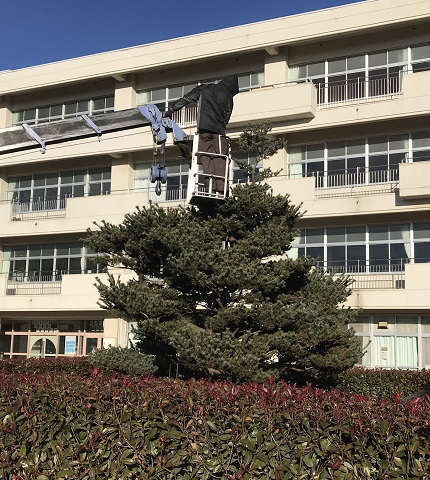 ずっと気になっていた、校舎の前の植え込みの中の シンボルツリーである、2代目五葉松の剪定(その木らしいきれいな姿に整えること)を、本校の卒業生で、保護者の新井さんに、1月の4日・5日にしていただきました。(6年生の新井君がおとうさんに頼んでくれたことから実現しました。新井君、ありがとう!)