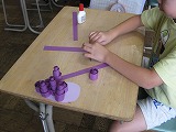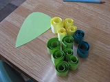 こすもす学級の児童は、季節を感じる掲示部物づくりを行いました。選んだ色画用紙をくるくる上手に丸め、素敵なブドウをしあげていました。
