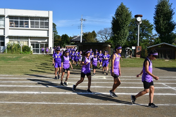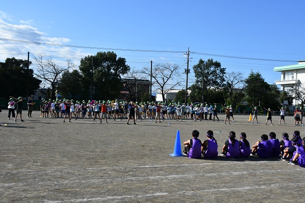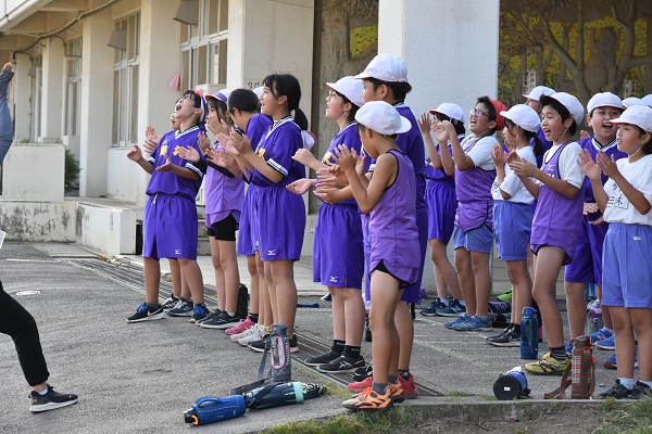 明日は6年生が親善運動会に参加します。そこで、今日は業前に5年生を中心に壮行会が開かれました。ユニフォームを着た先週の最終練習の様子と、壮行会の様子をご覧ください。