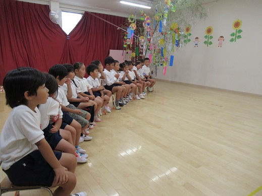 今日は、七夕まつり会を行いました。みんなで「たなばた」の歌をうたったり、七夕の由来となったお話をパネルシアターで見たり、ゲームをしたりして楽しく過ごしました。