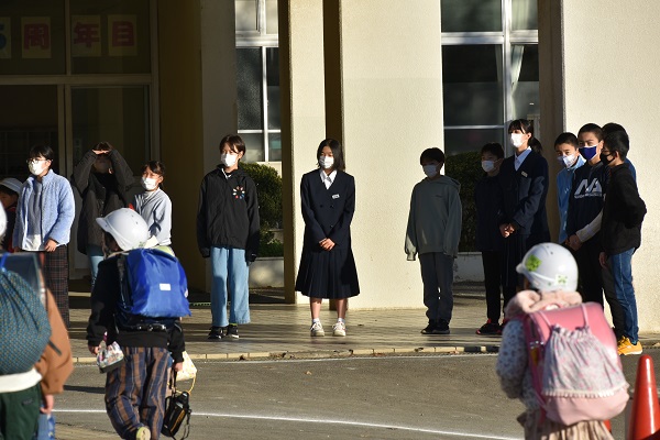 〇小学生の声が今一つ元気がないのは中学生に圧倒されたのか?2回目の合同挨拶運動は木曜日に行います。次は元気にあいさつできるといいいですね。