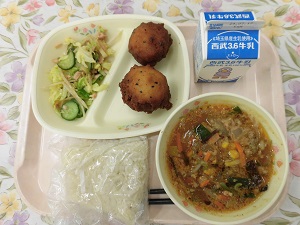 今日の給食のおからドーナツは、給食室で揚げた手作りです。