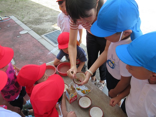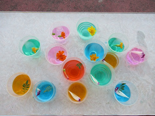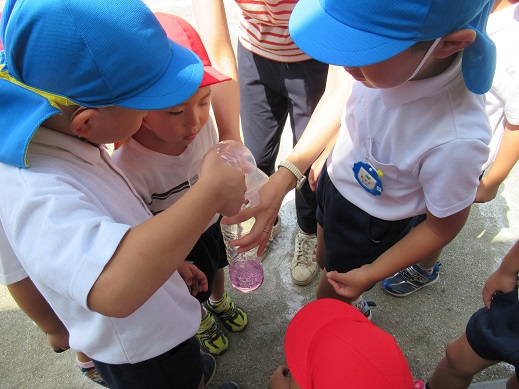 園庭に咲いている朝顔・オシロイバナなどの草花や、クレープ紙を使って、色を出していきます。草花は、すり鉢でよくすり潰してから水を入れると色がでます。クレープ紙は、水に浸すといい色が出てきます。