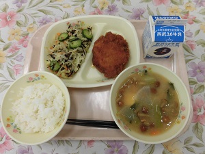 牛乳 ご飯 チキンカツ煮(かつ丼) ツナとひじきサラダ なめこ汁今日の給食は、人気のかつ丼です。 さっぱりした鶏むね肉に 給食室で衣をつけ揚げました。 サクサクに揚げたカツに しょう油ベースの甘辛いタレを絡めました。 タレがしみているので、ご飯が進むおかずでした。 ツナとひじきのサラダは、玉ねぎをきかせた しょう油ベースのドレッシングを 給食室で手作りしました。 ツナの旨味がひじきと野菜に絡み 食べやすいサラダでした。人気のサラダです。 |