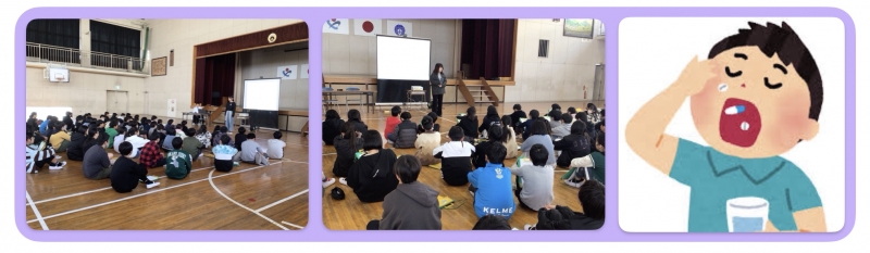 今日は、学校薬剤師の佐藤先生をお招きし、『薬物乱用防止教室』が行われました。体調を崩したり、持病を持っていたりすると薬を服用する機会がありますね。薬の服用方法を一つ間違えると、容態の悪化や命の危険に陥ることもあると、教えていただきました。